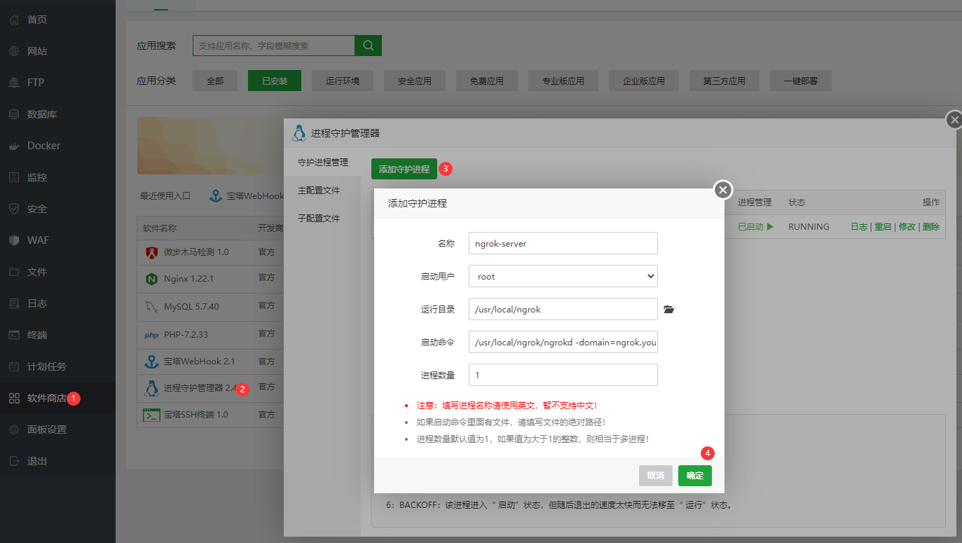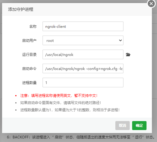 上线环境推荐使用宝塔守护进程管理器管理服务端进程,这样会随系统自动启动ngrokd服务端,如下图
